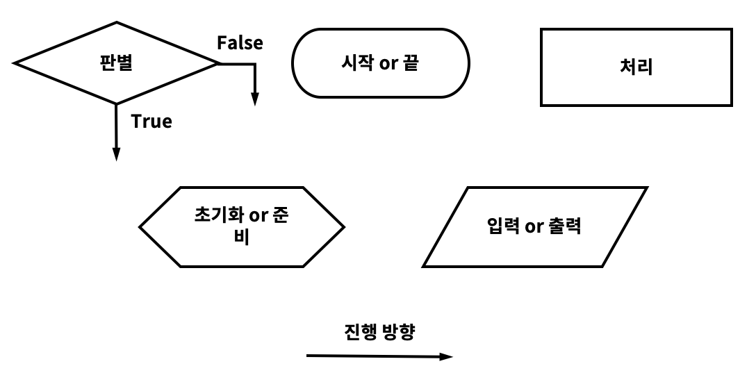 판별은 마름모로 true(참)와 false(거짓)를 필수로 하는 조건문 또는 반복문이다.